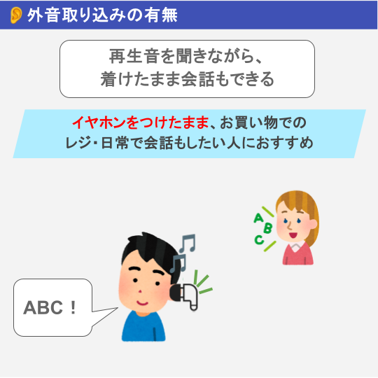 | 5 | 外音取り込み | △ | △ | ✔︎ | ✔︎ | |